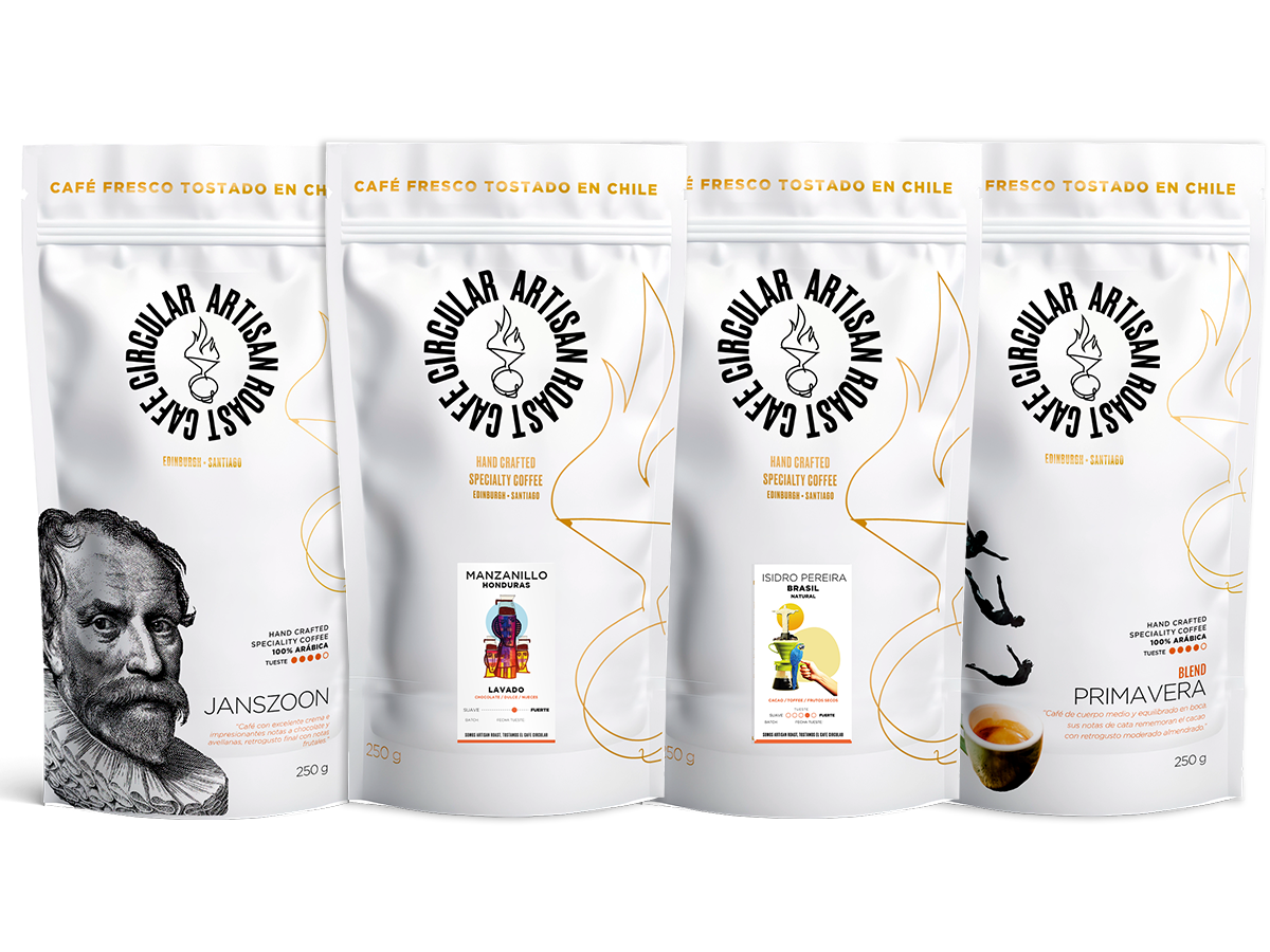 HONDURAS (Manzanillo), BRASIL (Isidro Pereira), Janszoon House Blend (Colombia-Perú) y PRIMAVERA BLEND (Colombia-Perú)